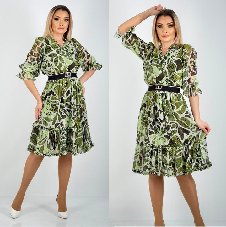 Voeg een vleugje natuurlijke elegantie toe aan je garderobe met deze prachtige groene print jurk. Deze jurk is ontworpen voor de moderne vrouw die houdt van een combinatie van comfort en stijl.