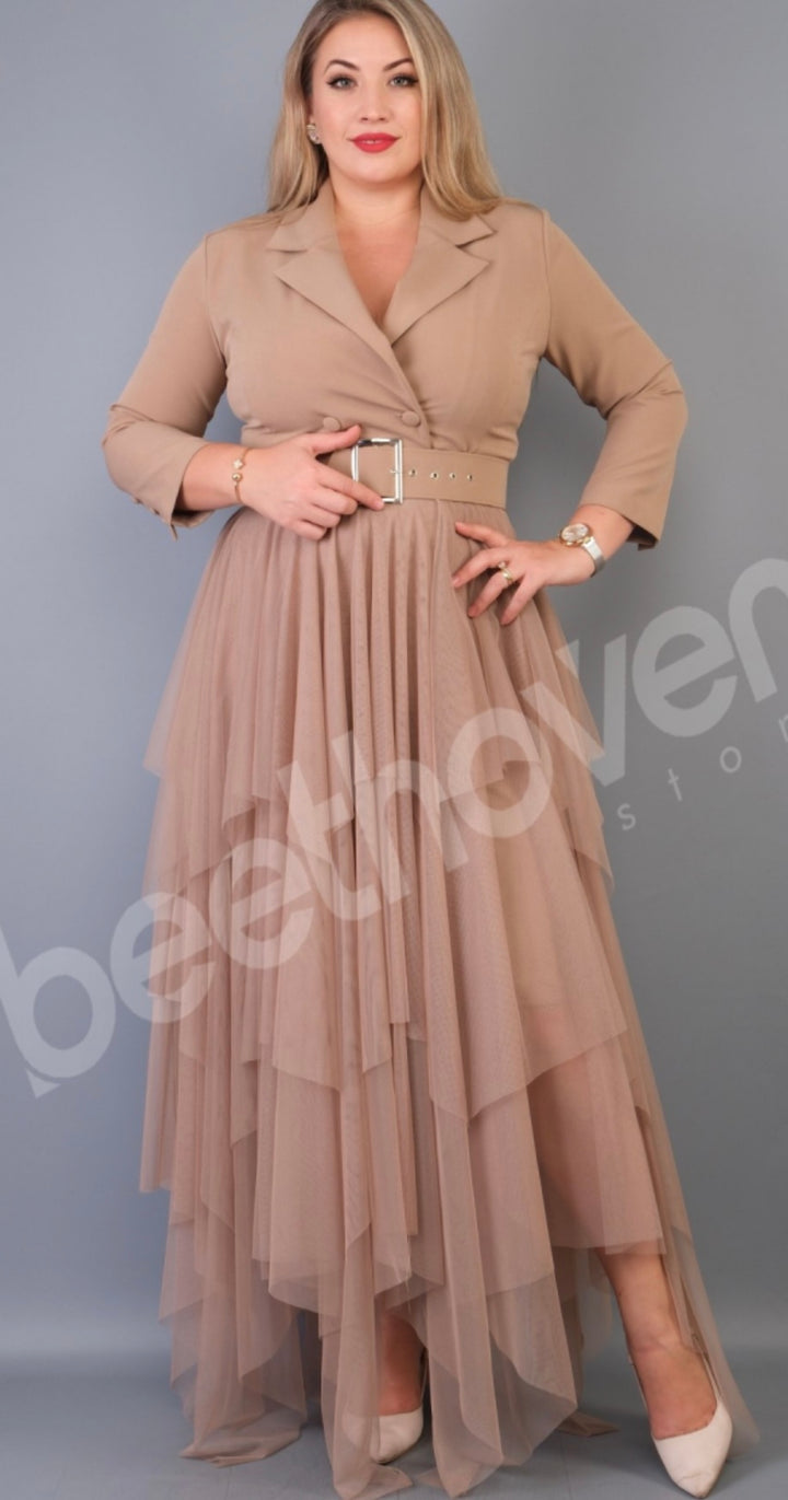 • Materiaal: De bovenkant is gemaakt van een stevige stof met het effect van een blazer, terwijl de rok is vervaardigd uit meerlagige, luchtige tule die zorgt voor een romantische en lichte uitstraling.