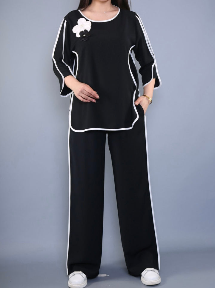 Deze set bestaat uit een losse top en een wijde broek, beide ontworpen met oog voor detail en een moderne flair.