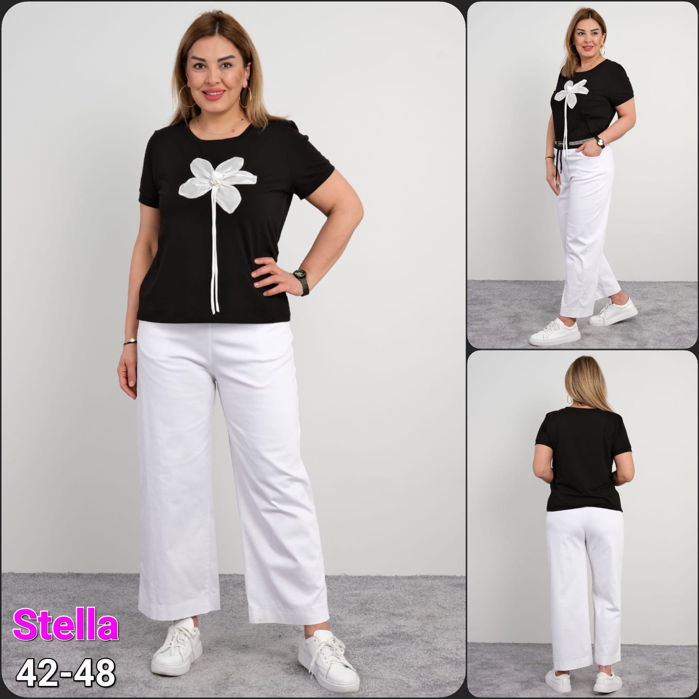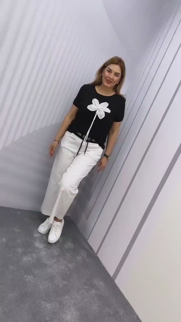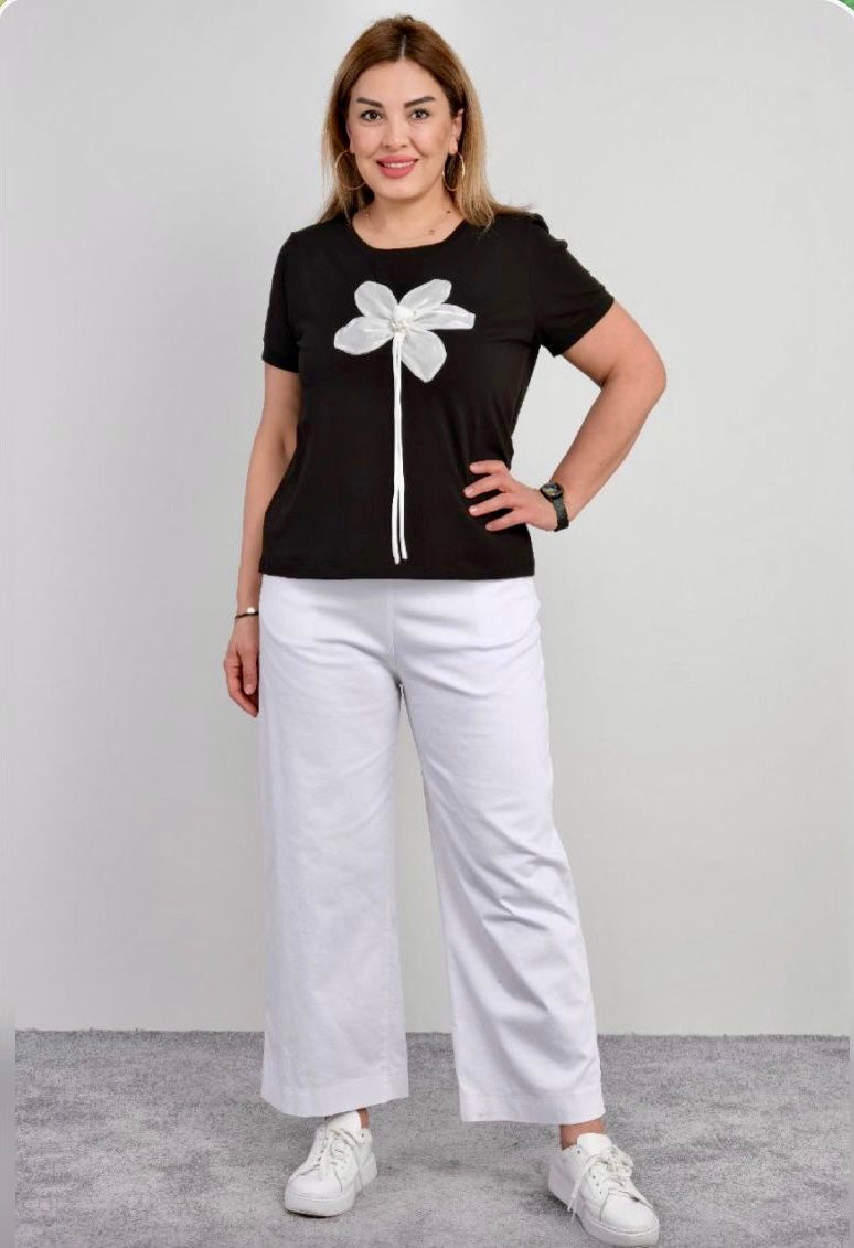 T-shirt: Zwart met een opvallende witte bloemapplicatie op de borst. De applicatie geeft een speelse en vrouwelijke touch aan het geheel.