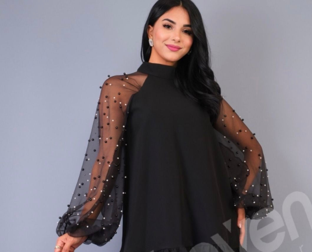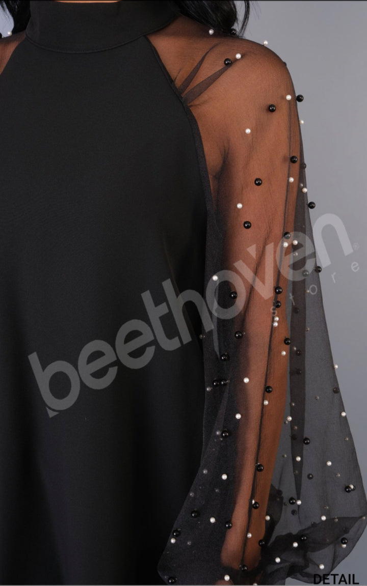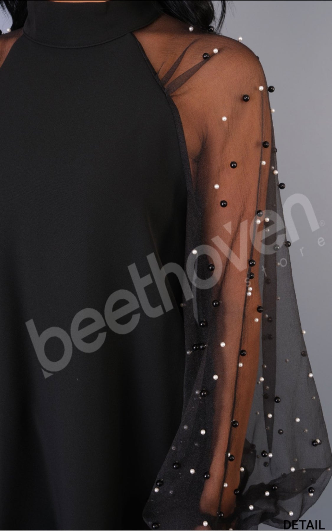 Deze elegante zwarte jurk is ontworpen voor wie stijl en verfijning waardeert. De licht uitlopende pasvorm biedt comfort en geeft de outfit een romantische uitstraling. De transparante mouwen van fijne mesh zijn versierd met subtiele decoratieve details, wat de jurk uniek en indrukwekkend maakt.